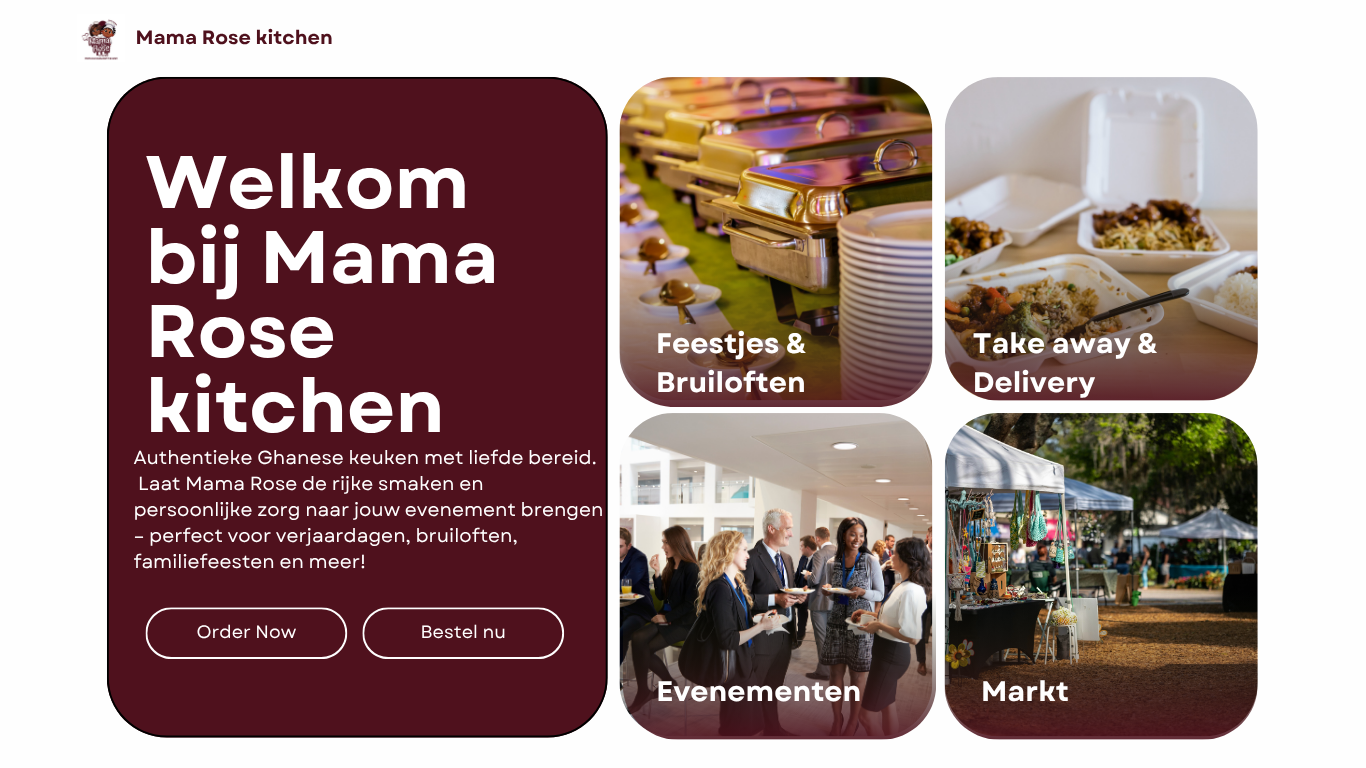 Mama Rose Kitchen is een cateringbedrijf gevestigd in Amsterdam, gespecialiseerd in Ghanees eten. Met liefde bereiden we heerlijke gerechten die de echte smaken van Ghana naar Nederland brengen. Naast catering zijn we ook te vinden op de markt.